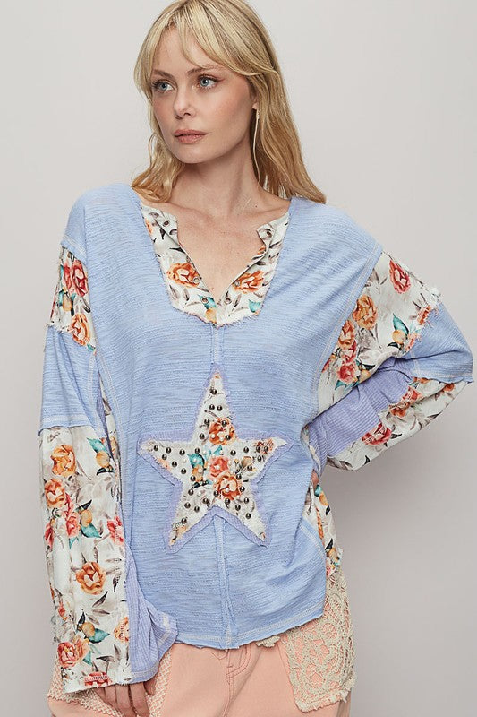 POL Floral Stud Detail Star Patch Notched Long Sleeve T-Shirt