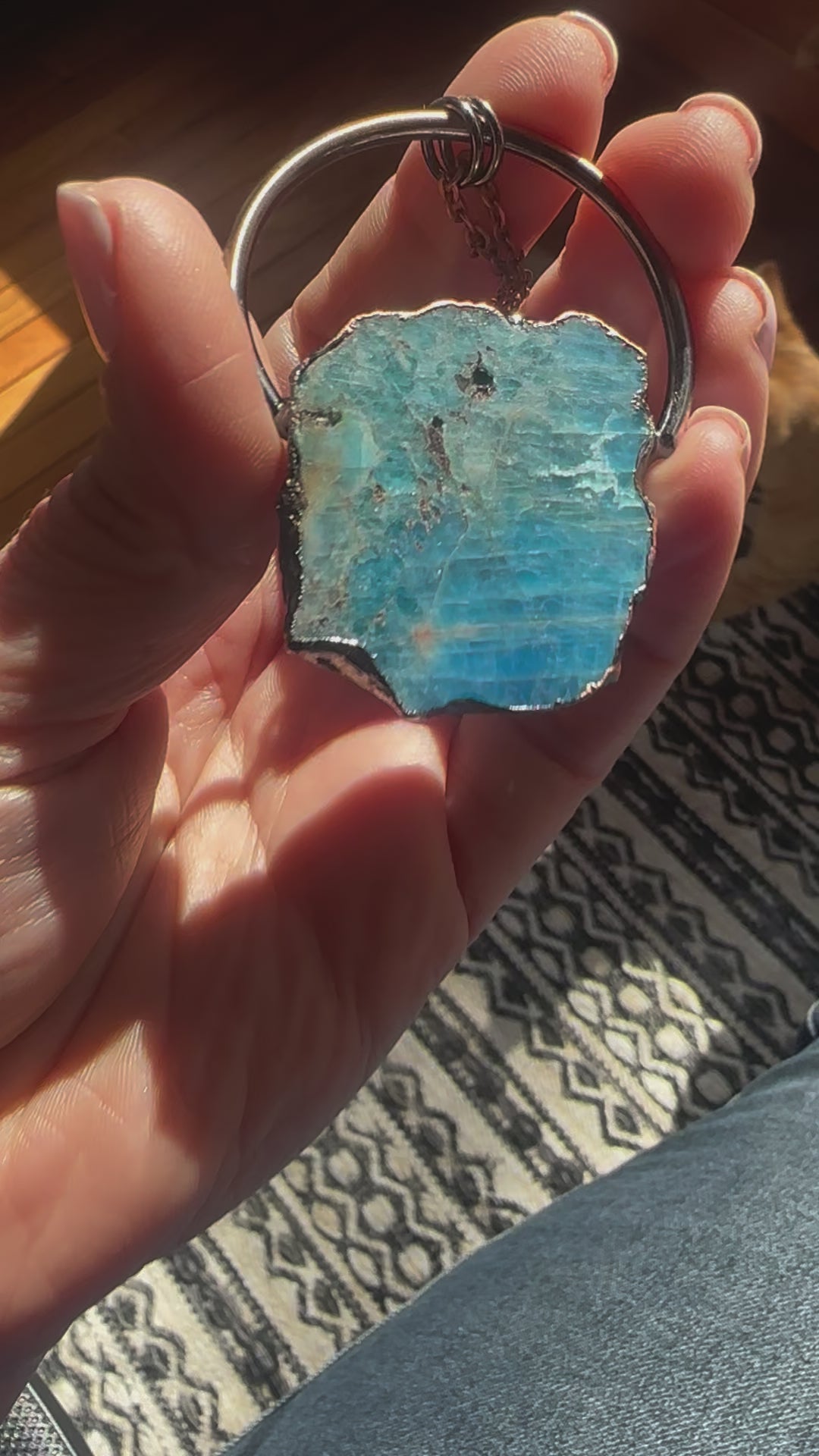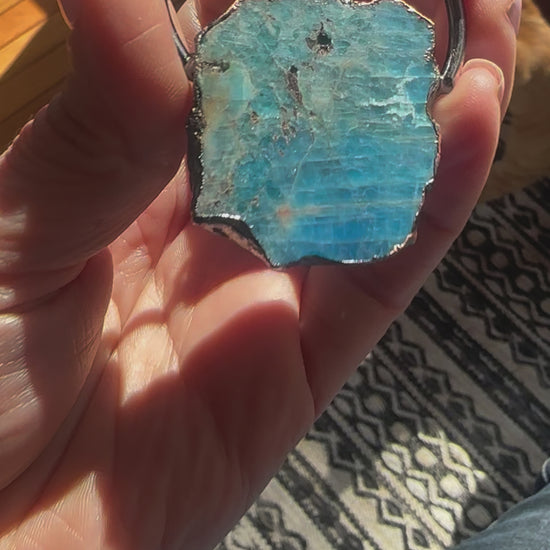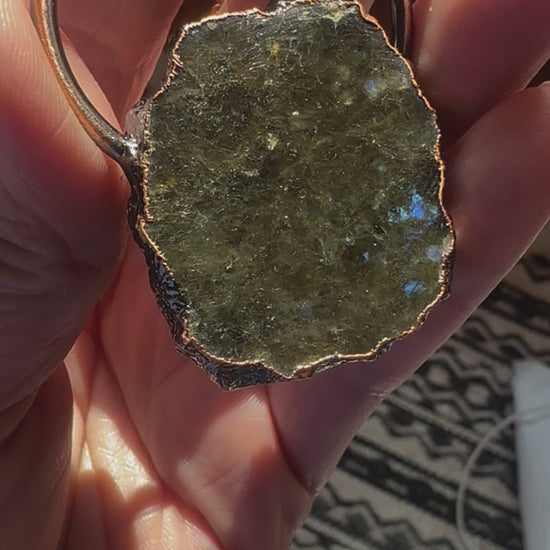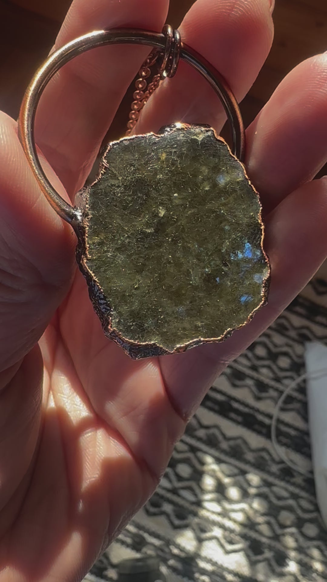 Just wow! Each necklace is handmade in vintage copper around a unique slice of Kyanite and Labradorite. Each natural stone vibrates with positive, healing, calming and transformational energy. * 20” antique copper chain * pendant is about 2” * no two stones are alike but all are magnificent. The necklace you receive will be similar but not exactly like what is pictured.