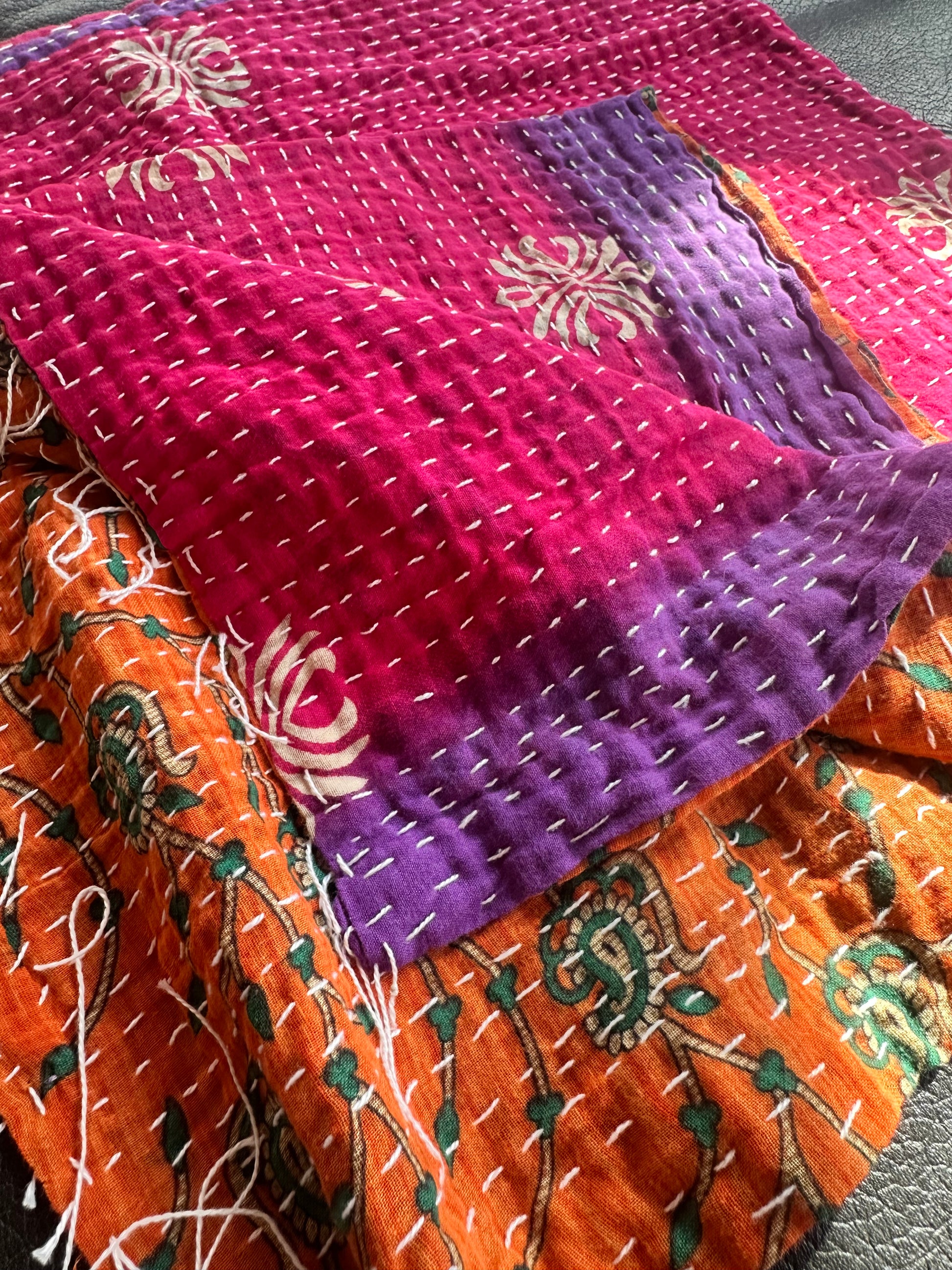 The 100% cotton and lovely colors truly make these the scarf for every season. Made in India from recycled saris. Fabrics are pieced together and then stitched by hand with a running stitch, called a kantha stitch. Both sides have different colors and patterns. Each scarf is entirely unique. Because these are made from recycled saris you may find some fading, repairs, spots, or other signs of use. Some see this as flaws but others see this as part of their character and story. Approx. 78" by 18" (200 cm by 45 cm)