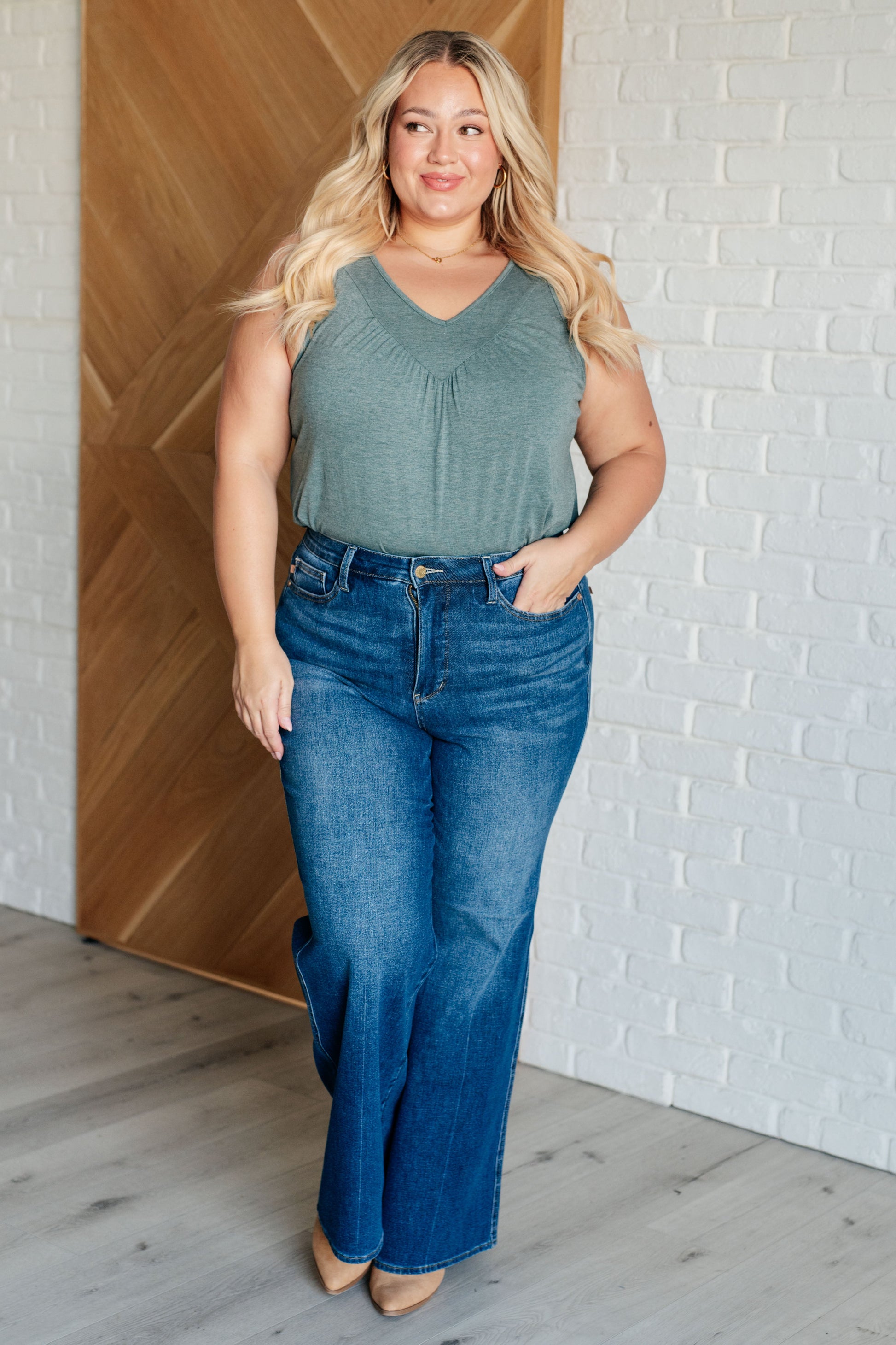 Stay effortlessly stylish and comfortable in our Not So Anxious V-Neck Tank. The flattering V-neckline adds a touch of elegance, while the ruched detailing brings a subtly chic twist. Sleeveless for easy wear during warmer days or under jackets, this tank is designed to keep you feeling at ease and looking fabulous. Ideal for both relaxed days and dressed-up outings, it’s a versatile staple for any wardrobe.